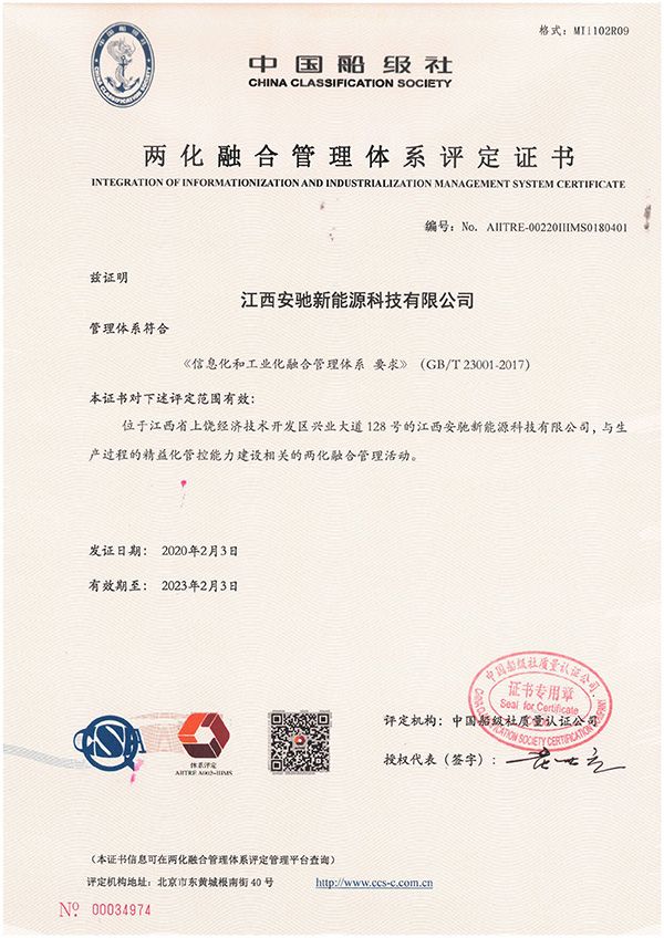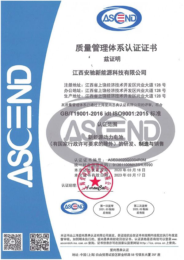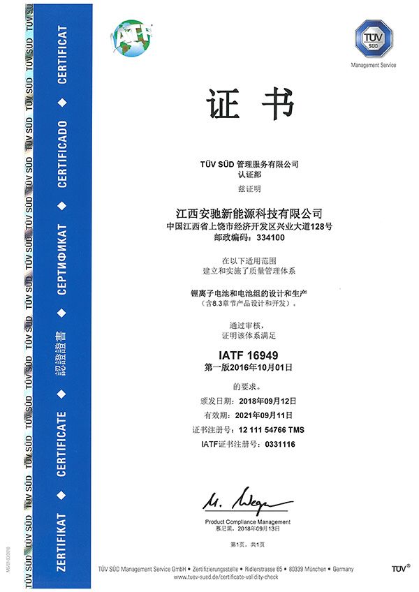 安馳新能源科技有限公司自建廠伊始,就以汽車行業(yè)體系為起點建立了高標準的質量管理體系,取得了TUV南德頒發(fā)的IATF 16949:2016質量管理體系證書。